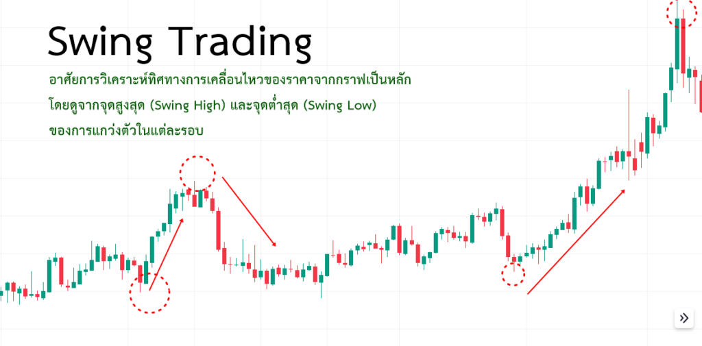 Swing Trading เป็นการเทรดที่ใช้ประโยชน์จากการแกว่งตัวขึ้นลงของราคาในระยะสั้นถึงกลาง โดยมีเป้าหมายที่จะเก็บกำไรจากการแกว่งตัว (Swing) ในแต่ละรอบ ไม่ได้มุ่งหวังผลตอบแทนที่สูงมากในคราวเดียว แต่เน้นทำกำไรทีละน้อยแต่บ่อยครั้ง